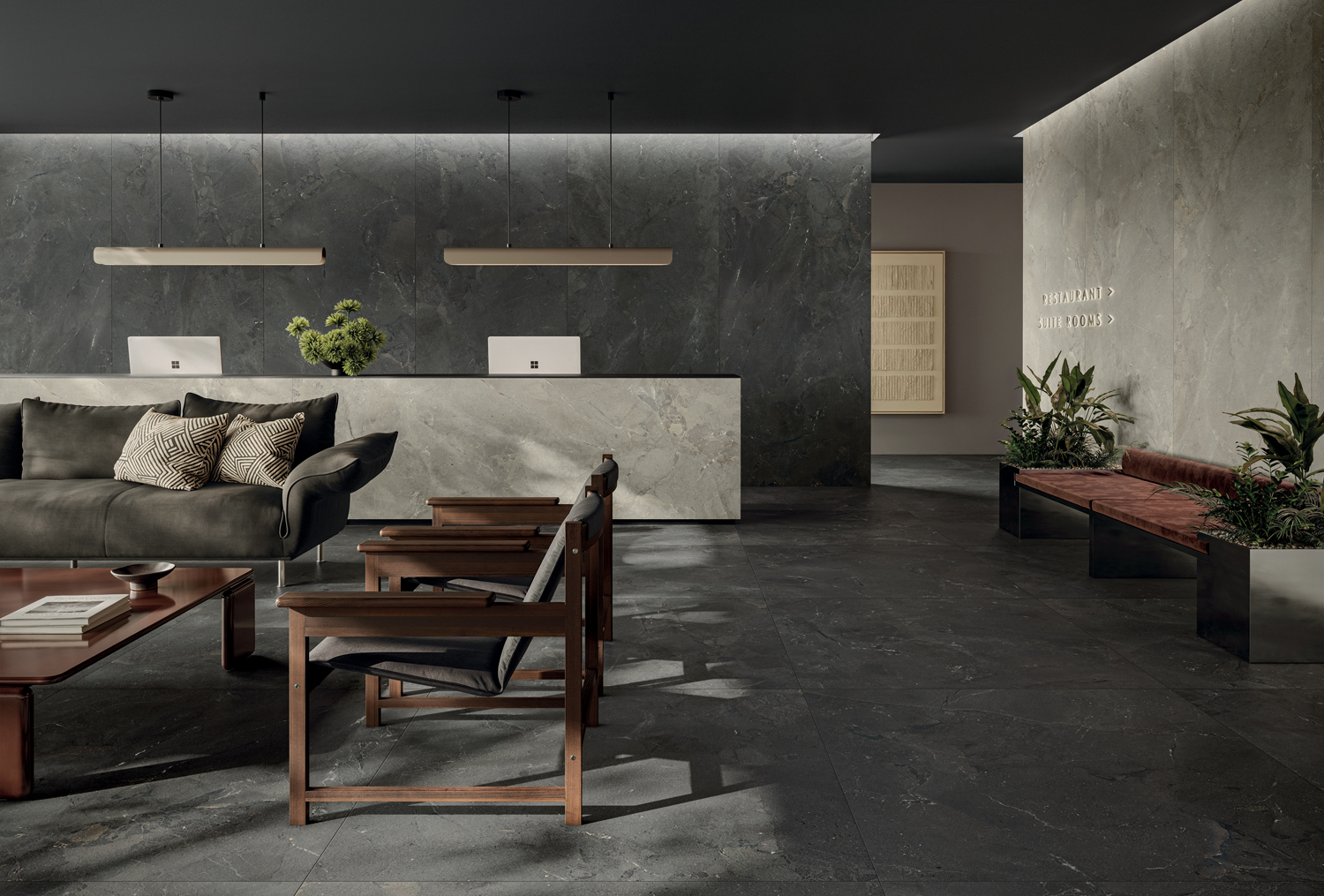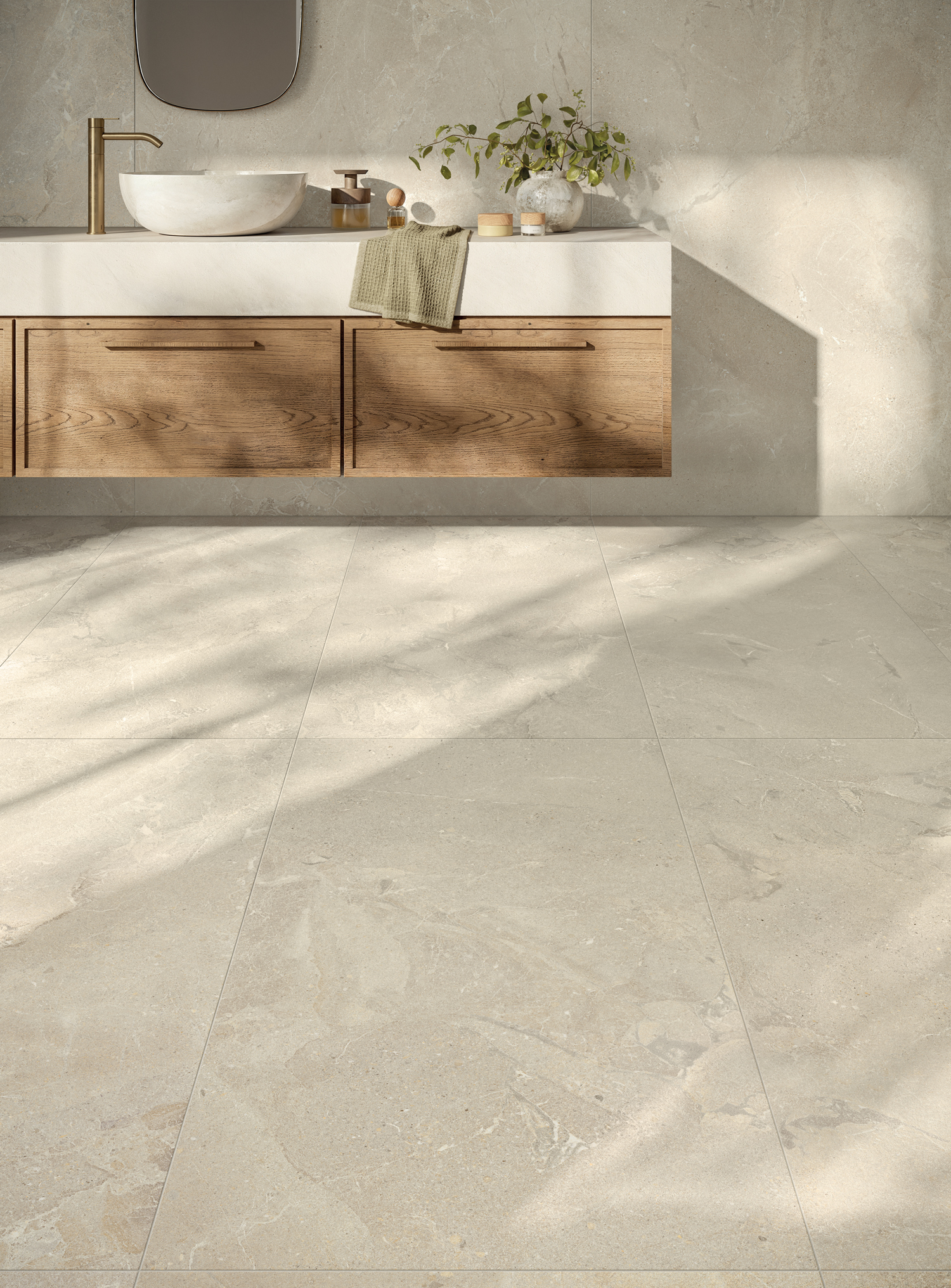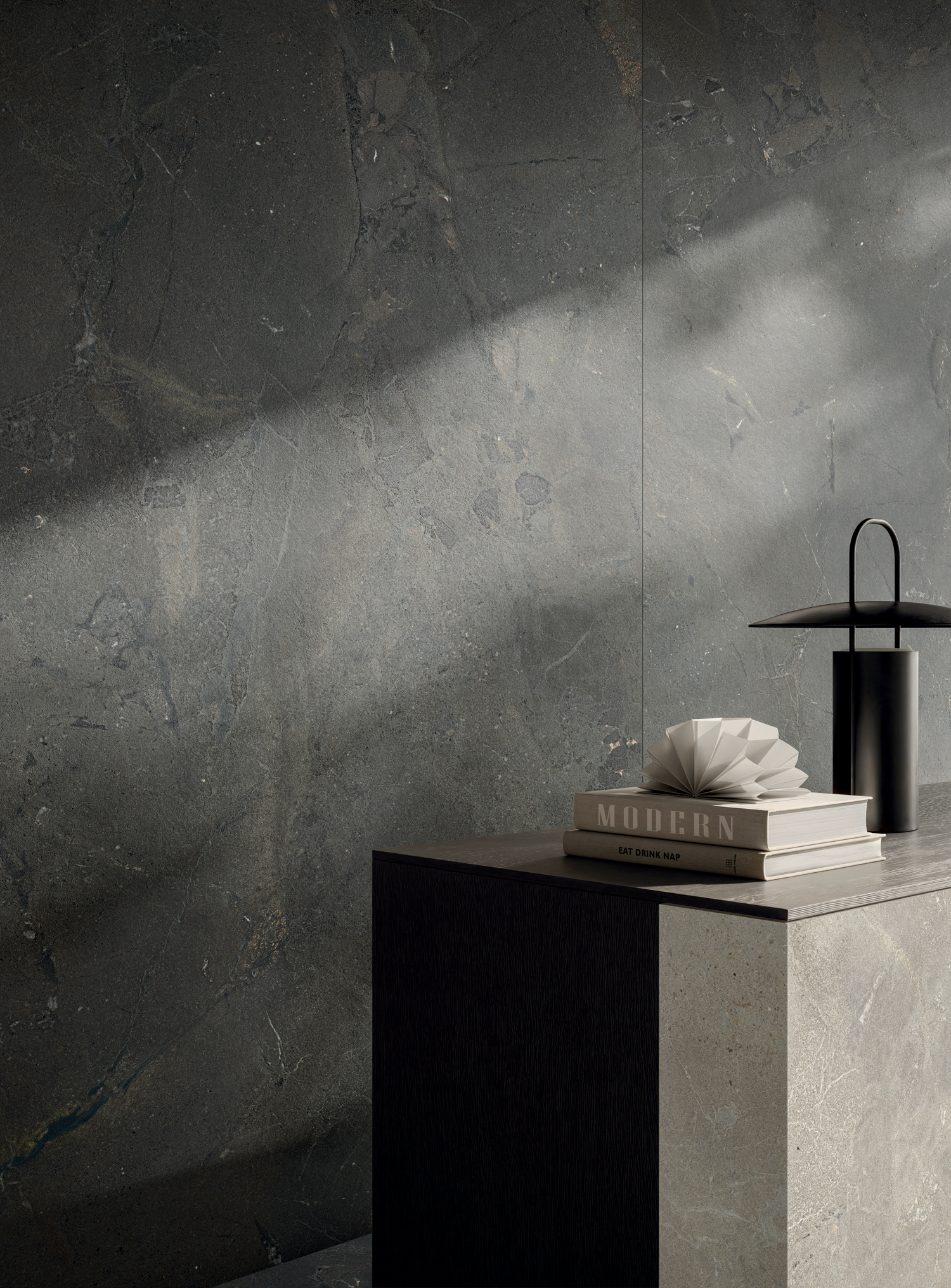 I grandi formati in lastra 120x278 cm e gres porcellanato 120x120 cm amplificano la ricchezza del movimento grafico e dei dettagli materici, mettendo in risalto l’unicità del soggetto con continuità visiva.