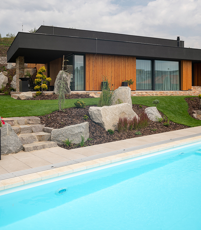 Grazie a paesaggi rigogliosi e un clima mitigato dalla presenza del vicino fiume, la città di Králův Dvůr gode di una posizione geografica davvero privilegiata nella regione della Boemia Centrale, in Repubblica Ceca. È qui che si sviluppa un’abitazione dai volumi puri e linee pulite che colpisce per il sapiente utilizzo di un mix di materiali, tra legno, pietra e ceramica.In particolare, in esterno dove la geometrica composizione di volumi entra in relazione con il giardino e la piscina, sottolineando la continuità armonica tra dentro e fuori. Per enfatizzare tale continuità è stata scelta la collezione effetto pietra di Panaria Ceramica che trasmette la stessa solidità materica delle tante pietre locali posizionate in giardino.