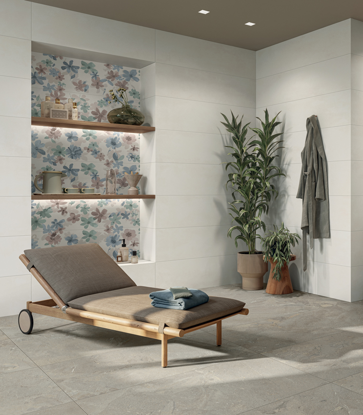 Nel bagno, Cloud Dancer esprime la sua dimensione più intima. Le piastrelle per il bagno in tonalità chiare amplificano la luce e trasformano lo spazio in un ambiente rilassante e accogliente.