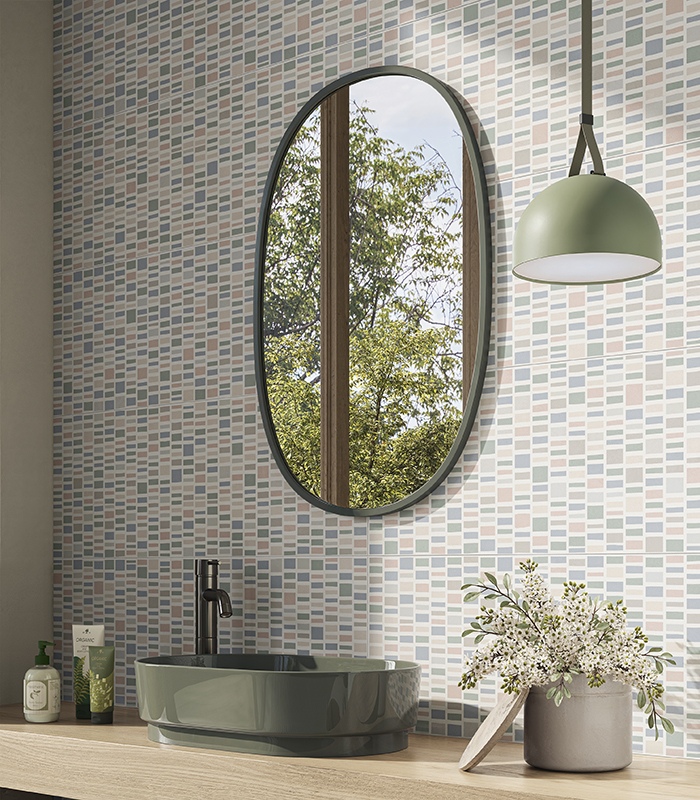 Accanto ai colori pieni trovano spazio pattern geometrici e piastrelle ceramiche decorate, per interni dallo spirito eclettico e contemporaneo, dove il colore diventa strumento di benessere e identità.