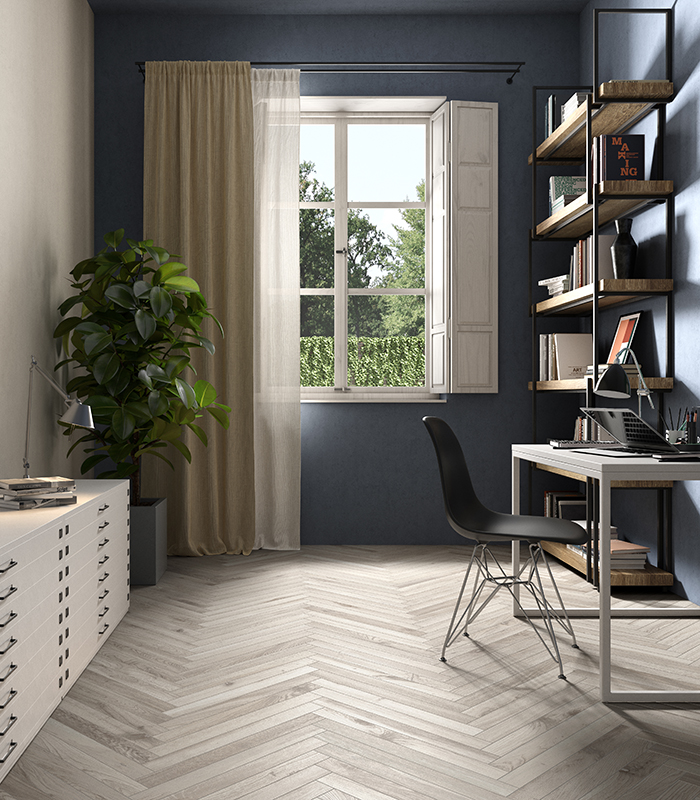 Il listello nel colore Inari, qui elegantemente posato a spina di pesce, incarna perfettamente questa tecnologia. Il risultato è un gres porcellanato che non solo riproduce fedelmente le venature del legname pregiato, ma offre una superficie Naturale morbida, resistente all'usura e all'assorbimento. Borealis estende così i confini tra interior design e mondo outdoor, garantendo un fondamento estetico e funzionale per l'ambiente studio o living, che oggi deve essere al contempo rifugio personale e contesto professionale.